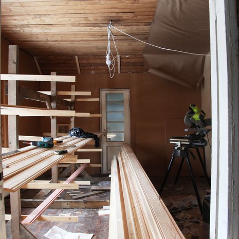 Sahanpurupölyssä on hengailtu reilu pari kuukautta sen jälkeen kun lattiat nostettiin ylös. Leveät, vanhat lankut laitetaan takaisin paikalleen ja uudet laudat pitäisikin itse asiassa laittaa piakkoin tilaukseen. Toivoimme, että purettujen kattolevyjen alta olisi paljastunut paneelikatto, mutta paria huonetta lukuunottamatta toive ei toteutunut. Raakalautaahan siellä! Ja paneeli, mitä parissa huoneessa on, on sen verran huonokuntoista että laitamme joka huoneeseen uudet kattopaneelit.